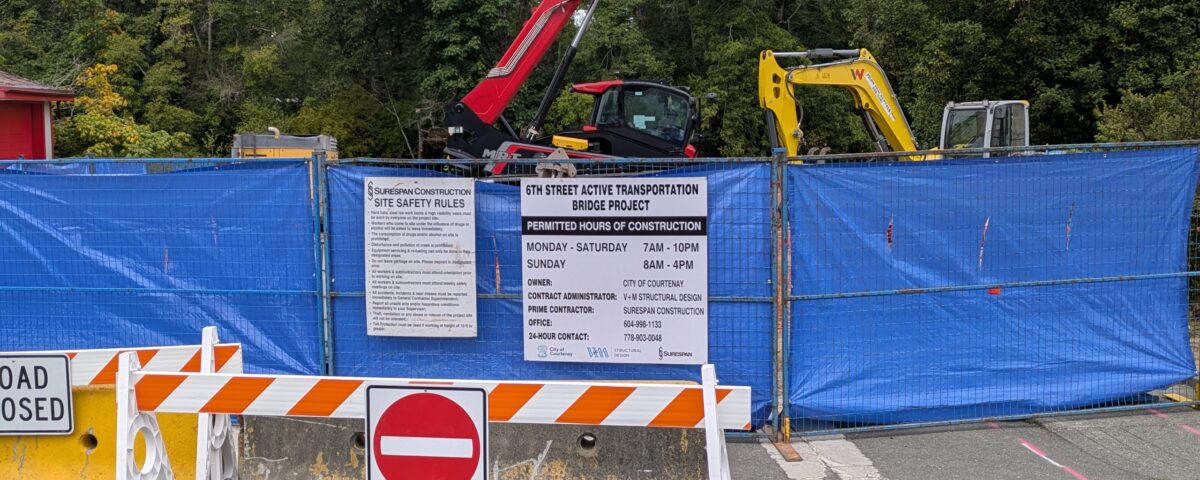 Clearing and foundation work has begun on the 6th St Active Transportation bridge in downtown Courtenay. This project has been a dream and a political football for over a decade. As many of you know, the Cycling Coalition has expressed both support and concerns in the past and we have engaged in the conversation as best we could.
